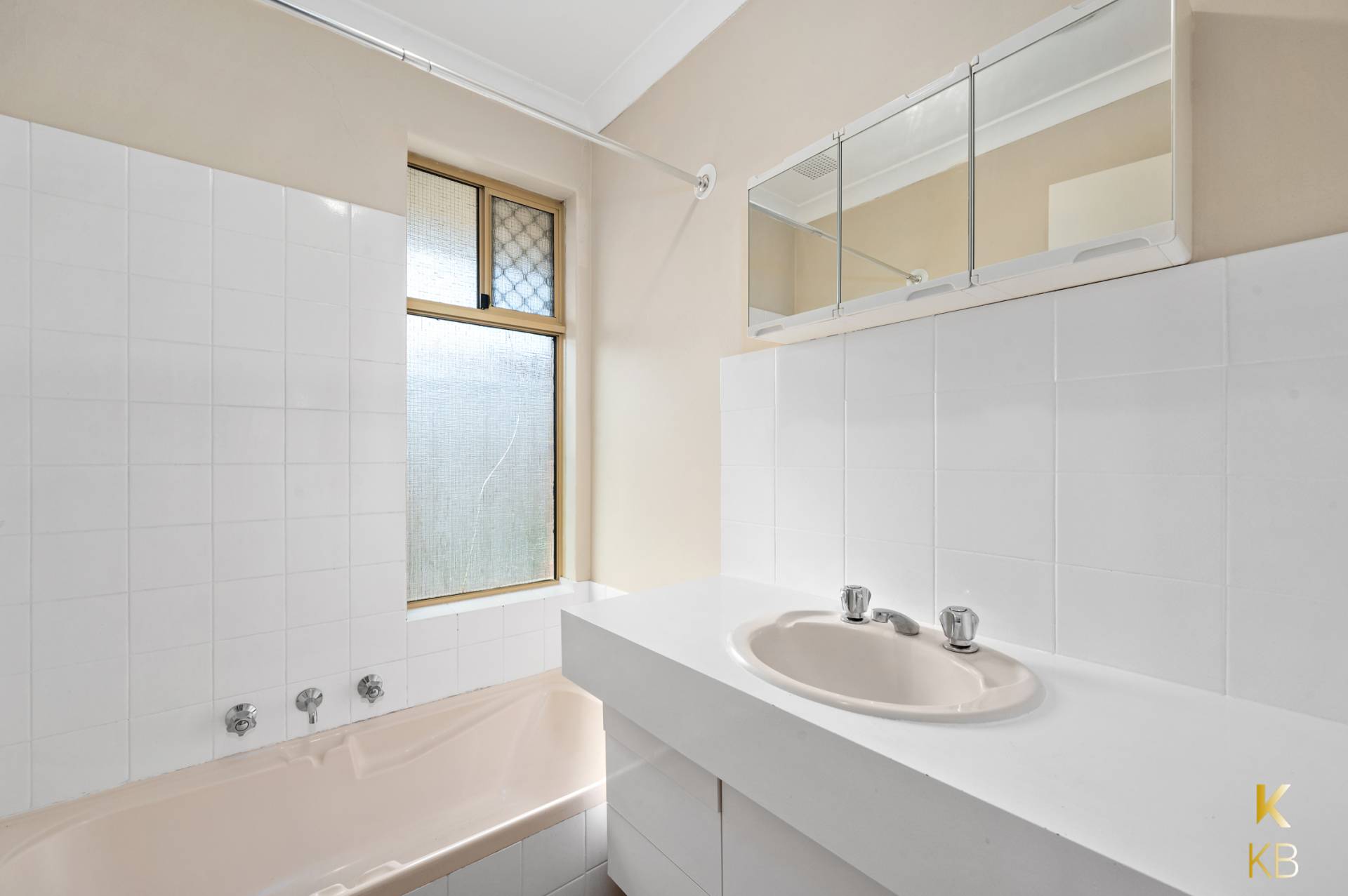 Bathroom with bath, shower and vanity, separate WC and separate laundry opening to the rear of the house.
