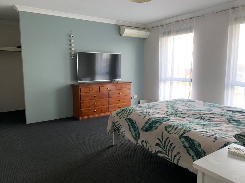 * Master bedroom with carpet and Reverse Cycle Split air con unit.