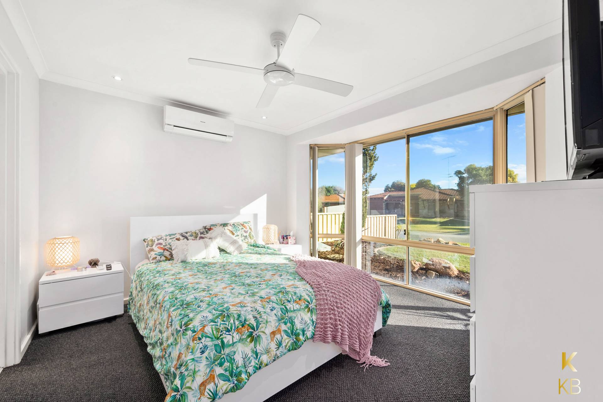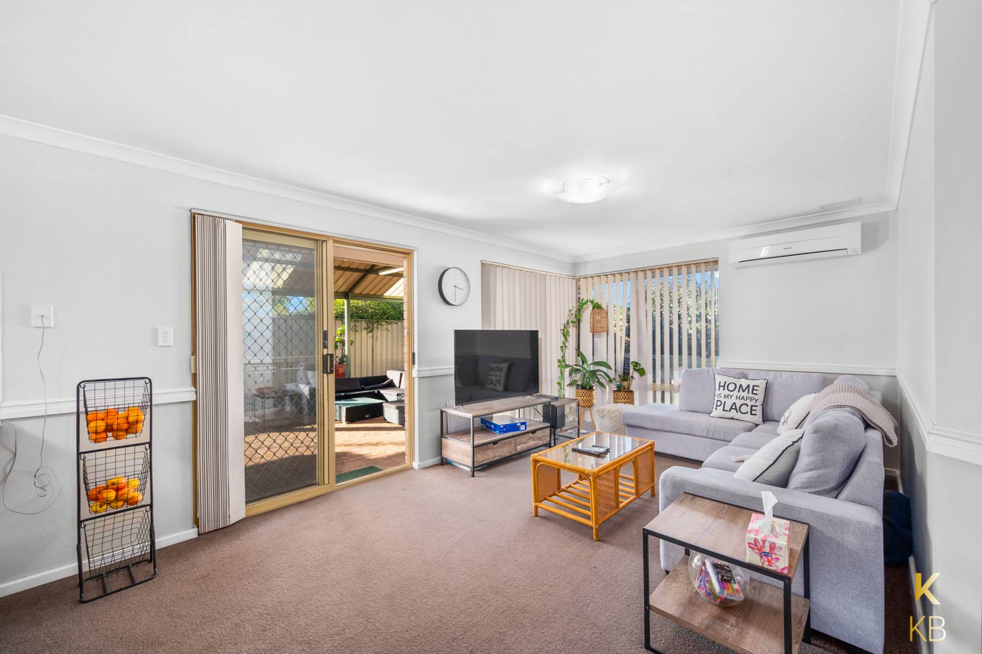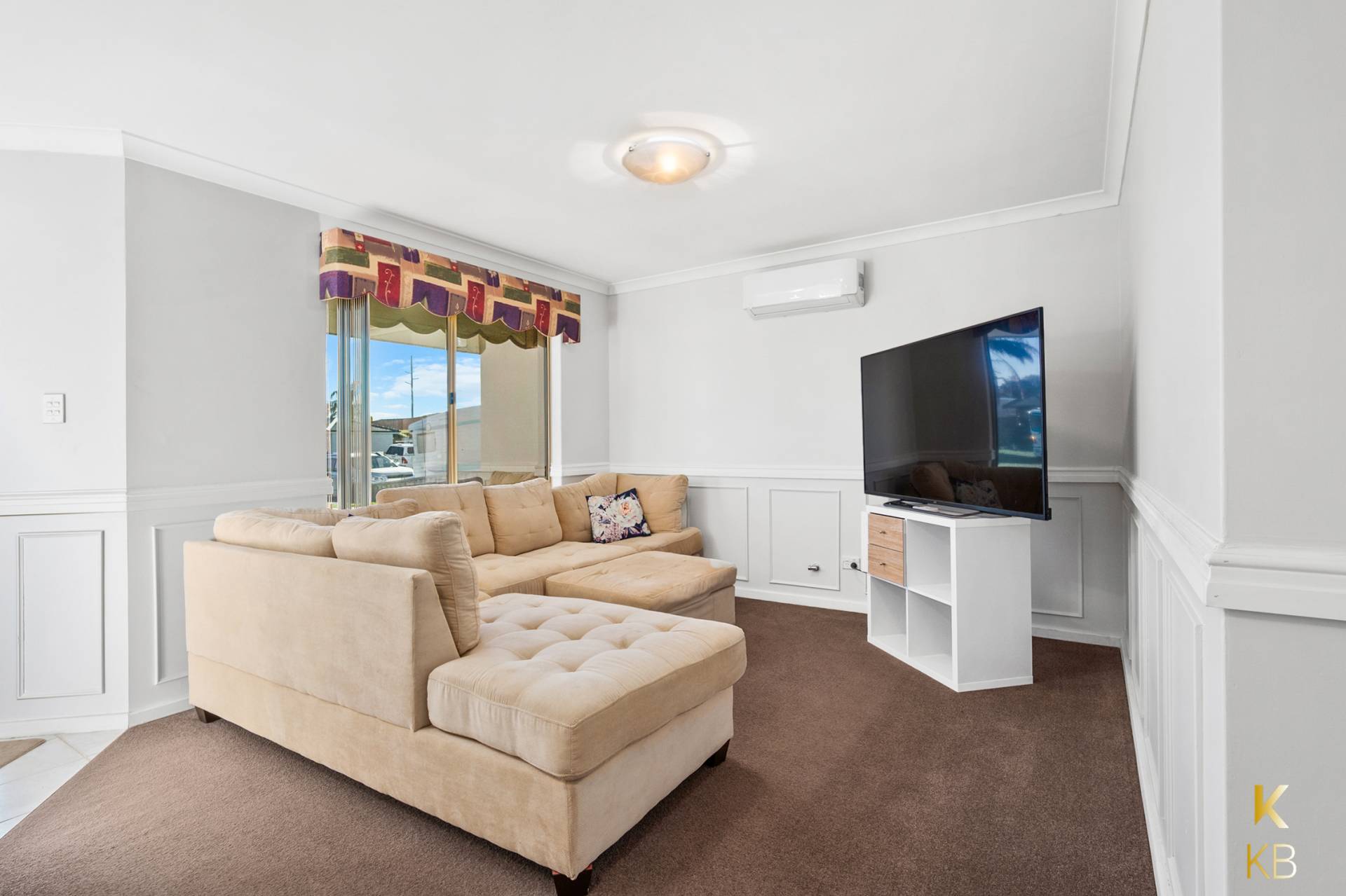 The home is painted and presented with modern neutral colours and fitted with beautiful window treatments and quality light fittings T/O. At the front of the property is the main lounge room fitted with a gas point and a reverse cycle split A/C.