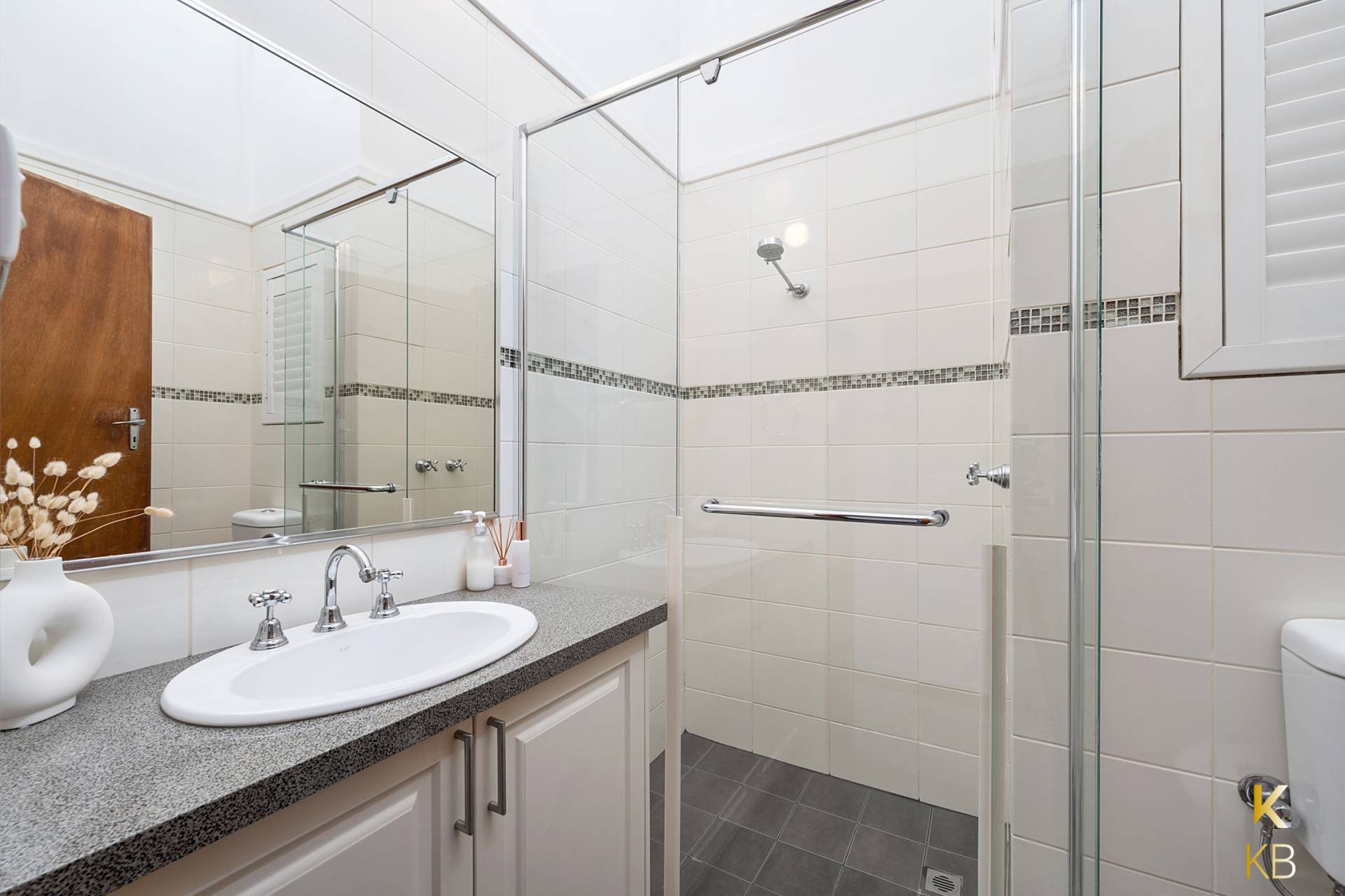 Beautifully renovated bathroom with tiled flooring, tiled shower and vanity unit with storage and feature mirror.  Easy maintenance.