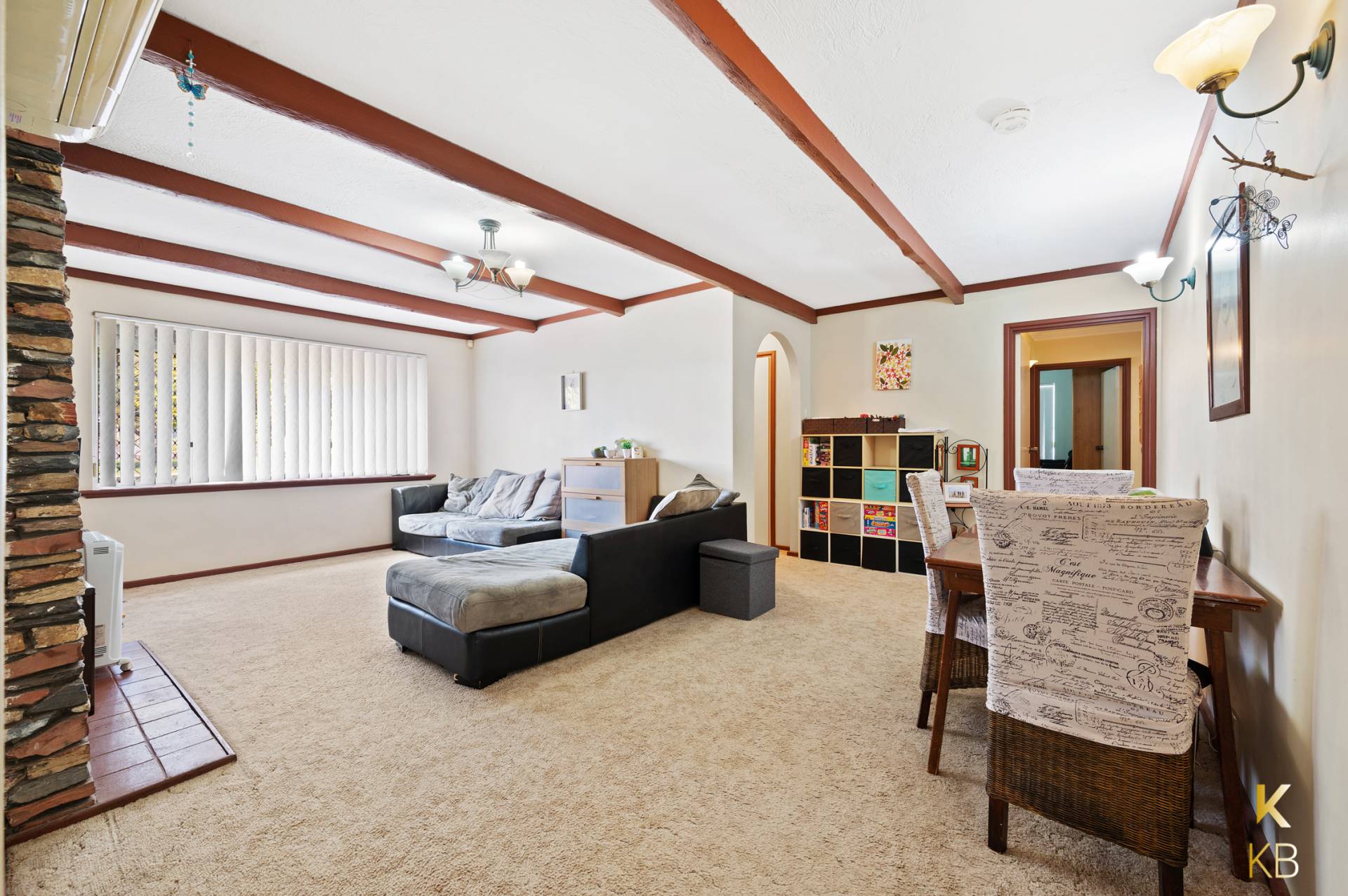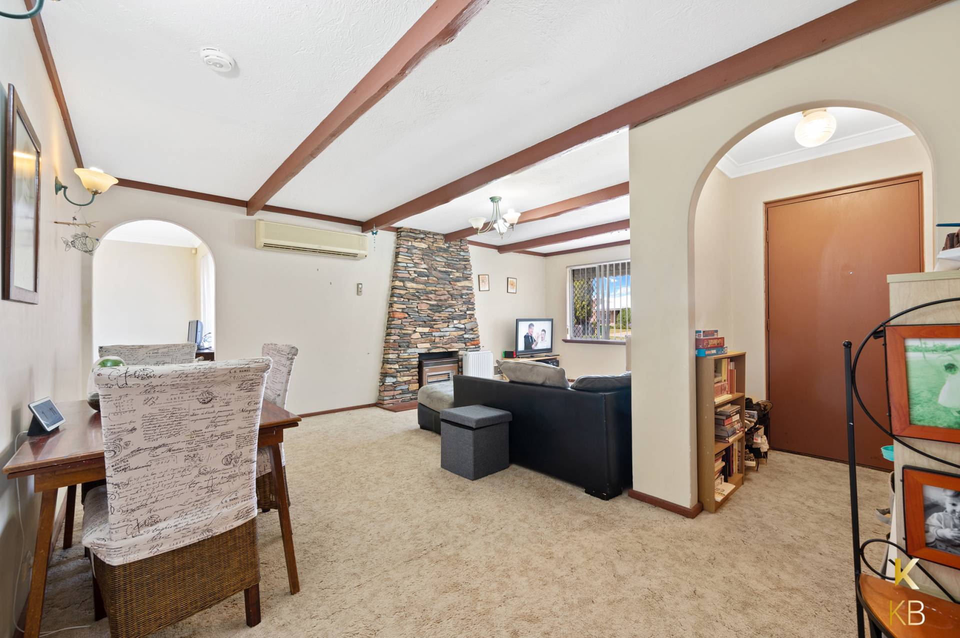 • Exposed timber ceiling beams and split-system air conditioning also to living room