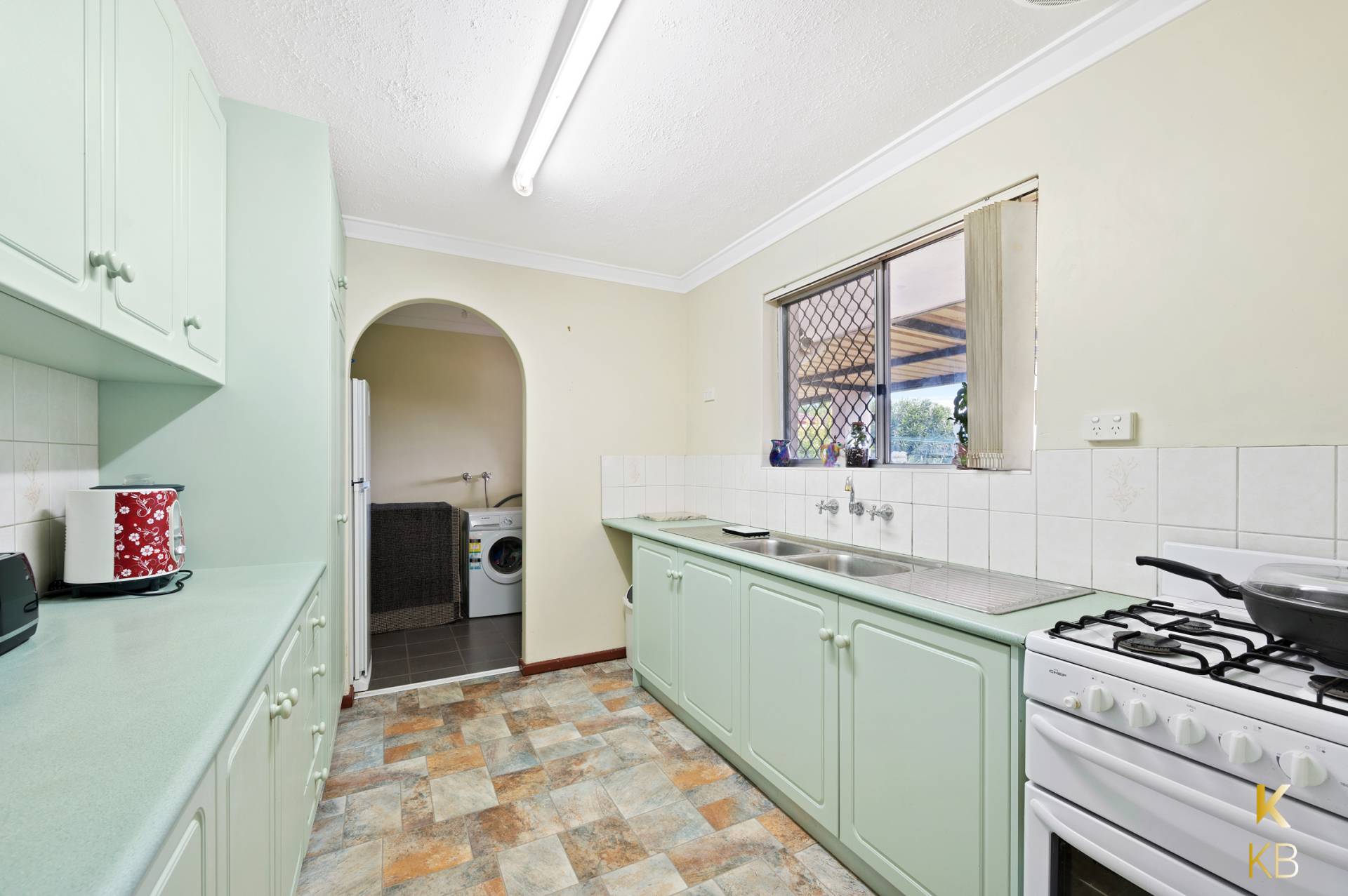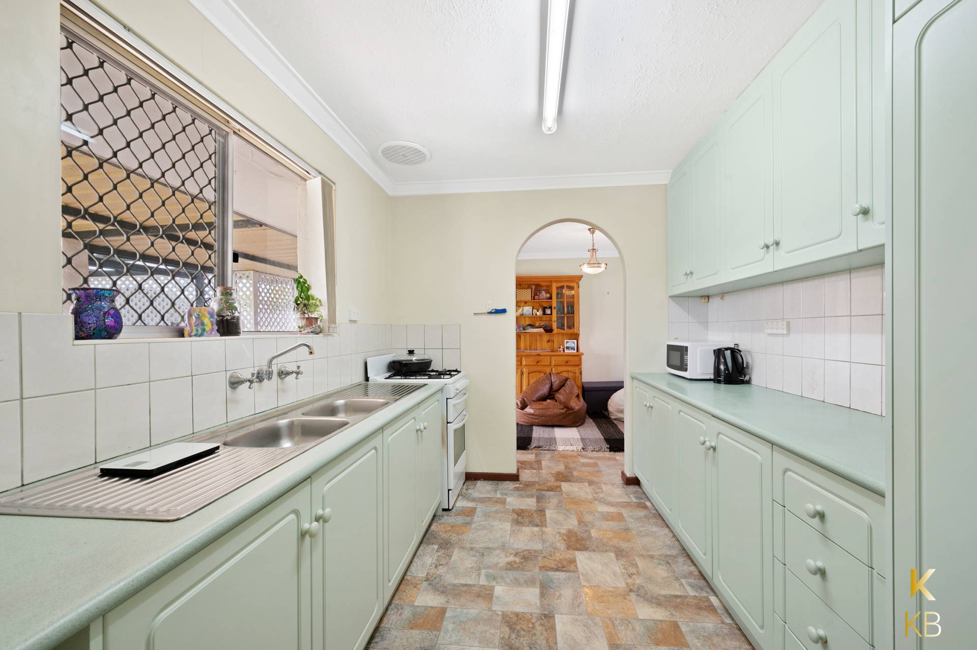 • Generous galley-style kitchen features gas cooking and a double pantry