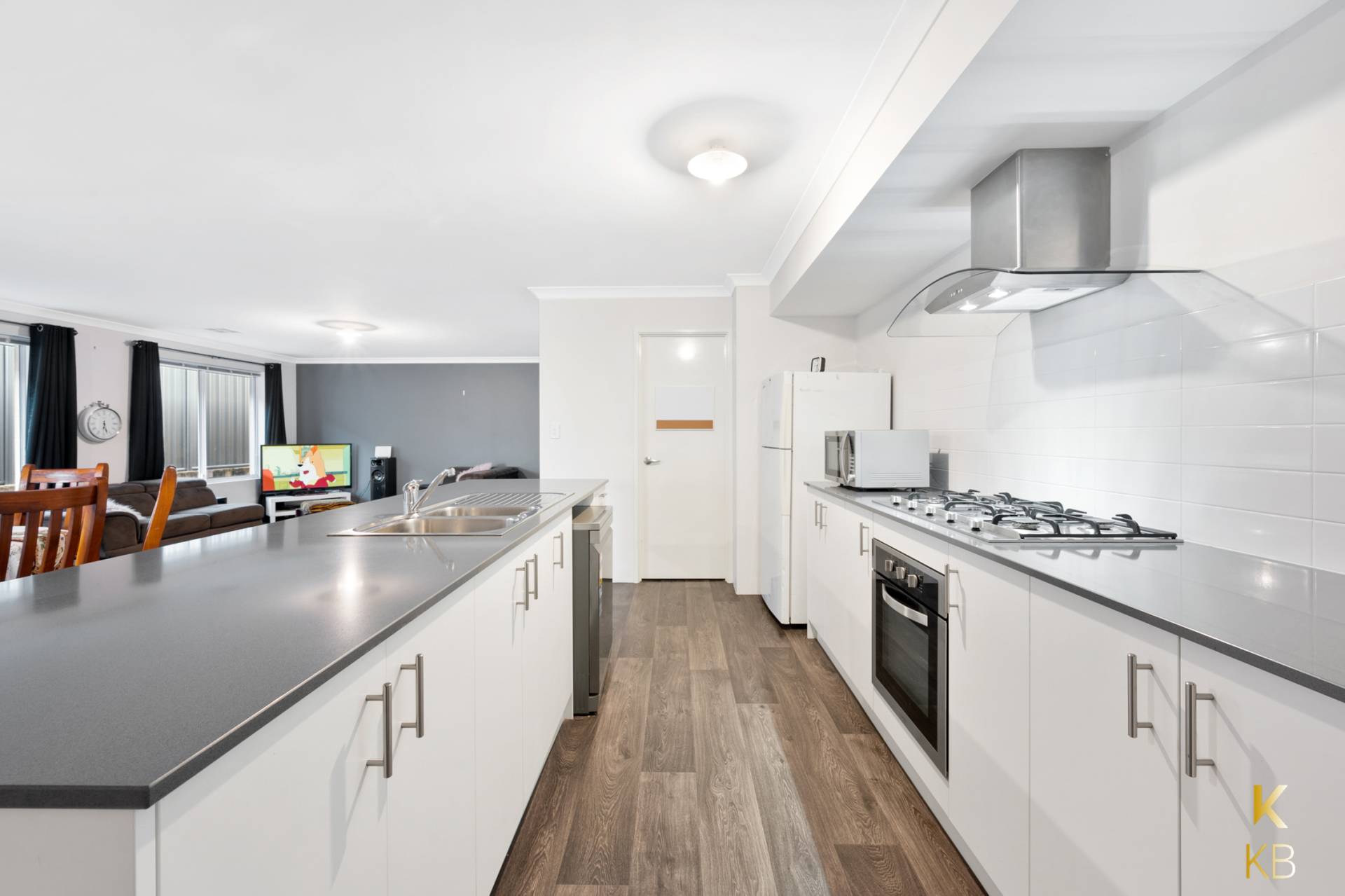 Inviting galley style kitchen with stone benchtops;  built in electric oven, five gas burner cooktop, and plenty of cupboard and storage space as well as a large walk-in pantry.  Kitchen overlooks spacious living and dining area so keeping an eye on the family will be a breeze.