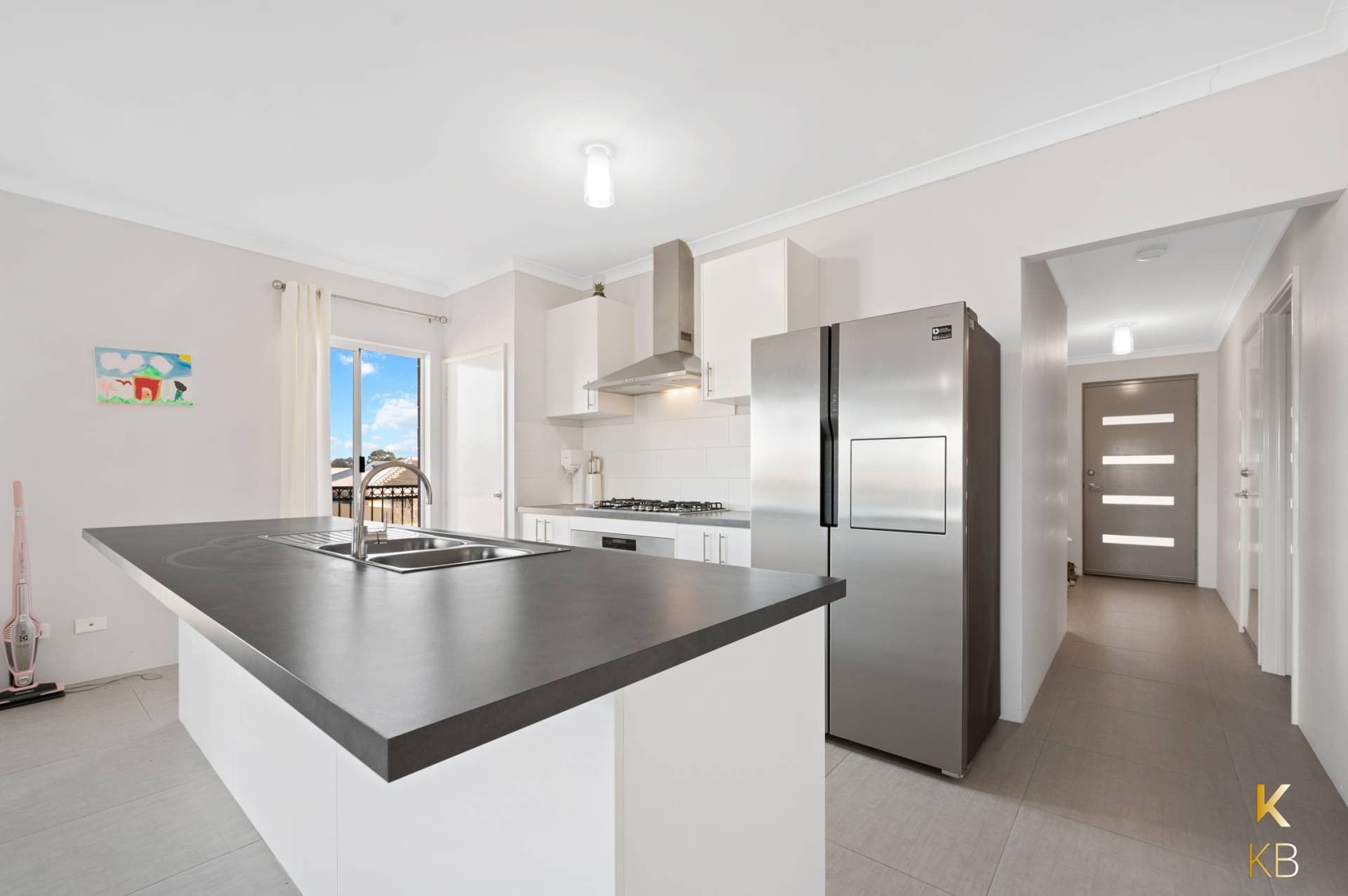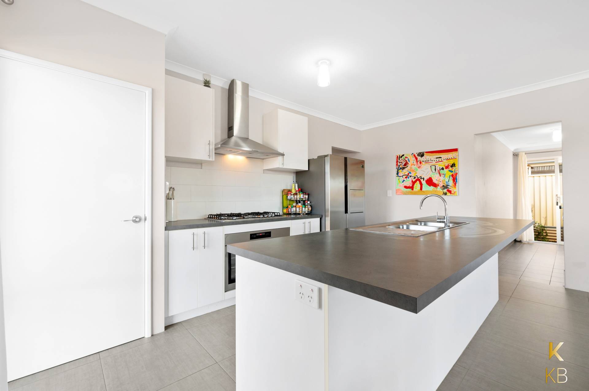 The huge open plan kitchen comes with a 900mm stainless steal oven breakfast benchtop and plenty of storage space.