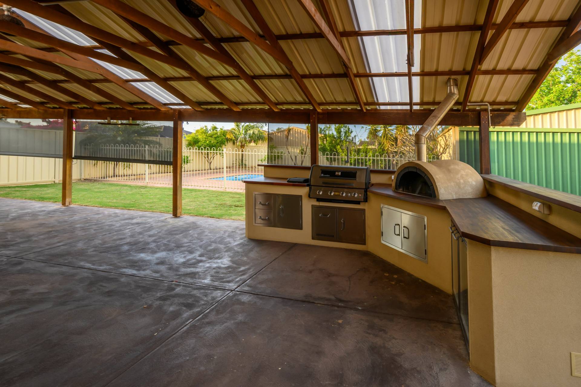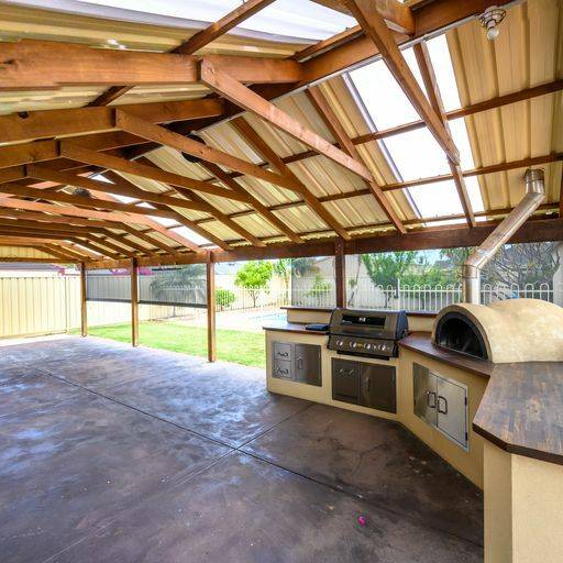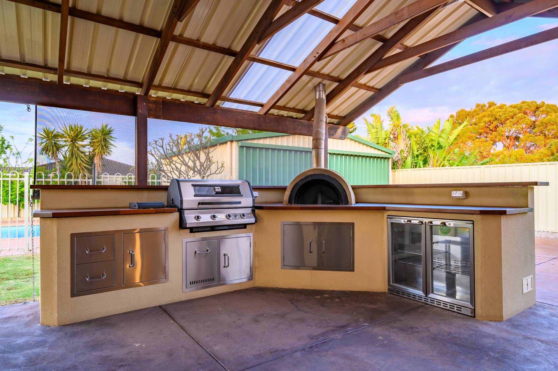The backyard is a private sanctuary complete with its own outdoor kitchen and pizza oven, perfect for entertaining, overlooking a beautiful, sparkling swimming pool.