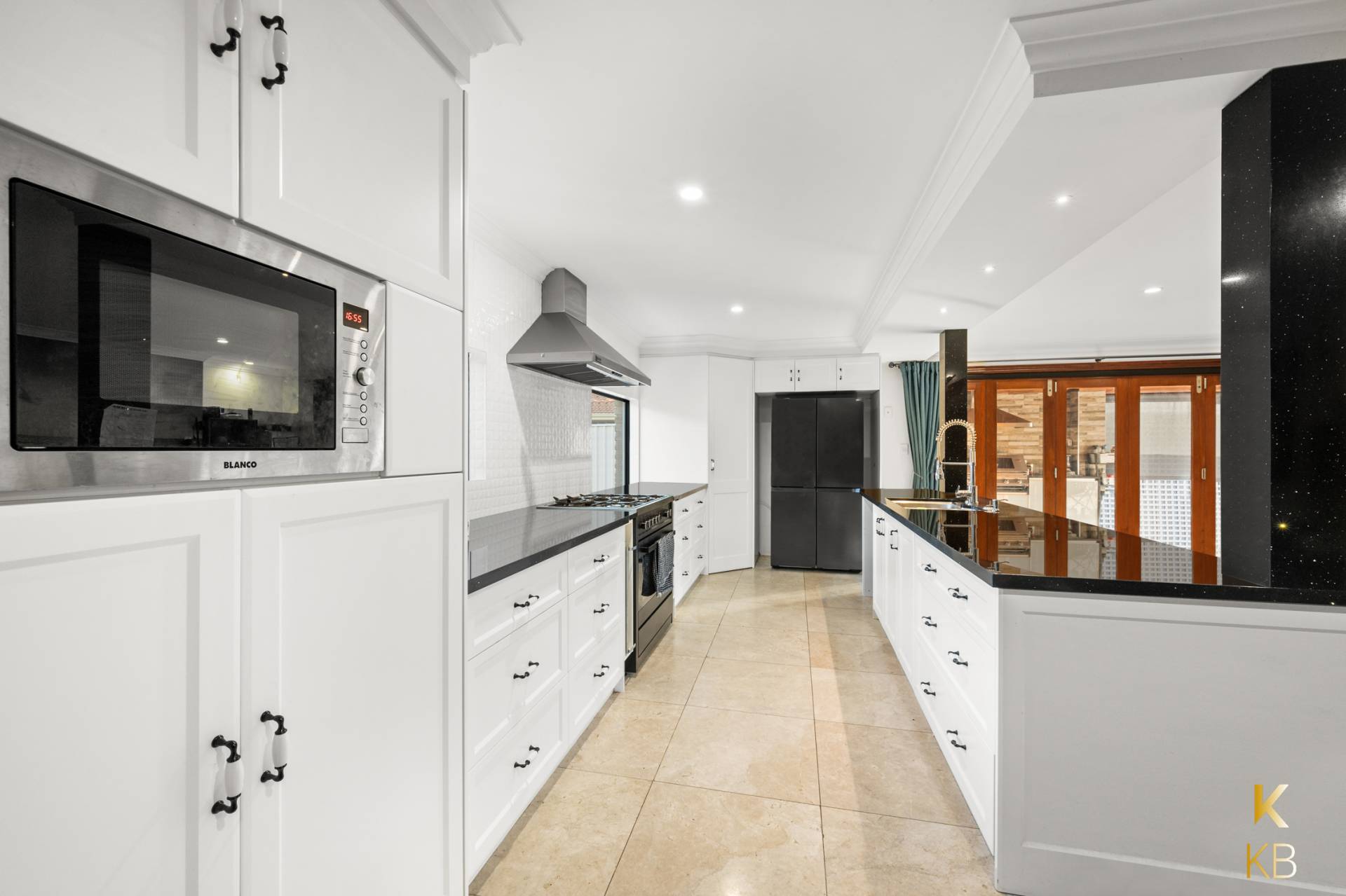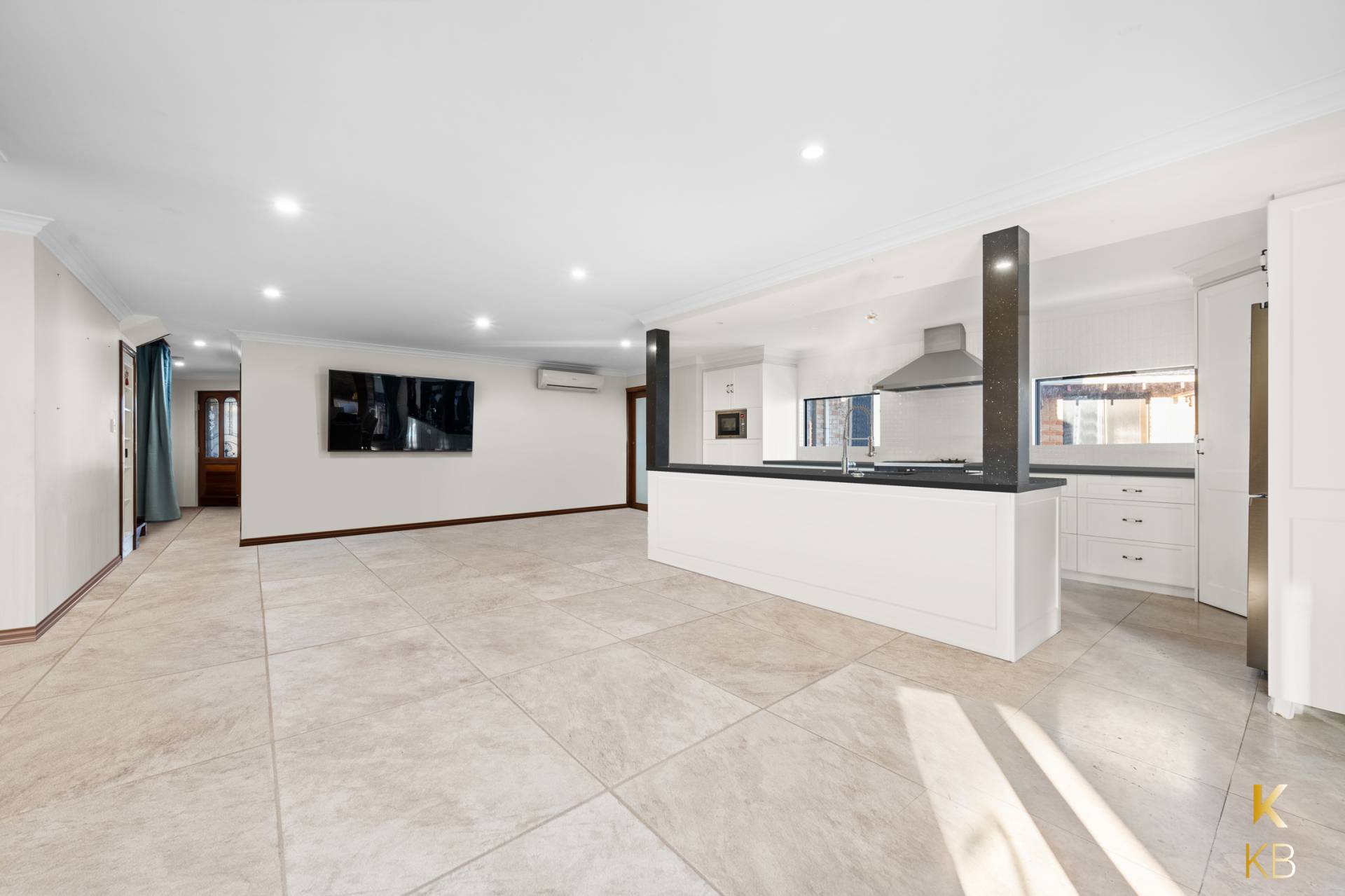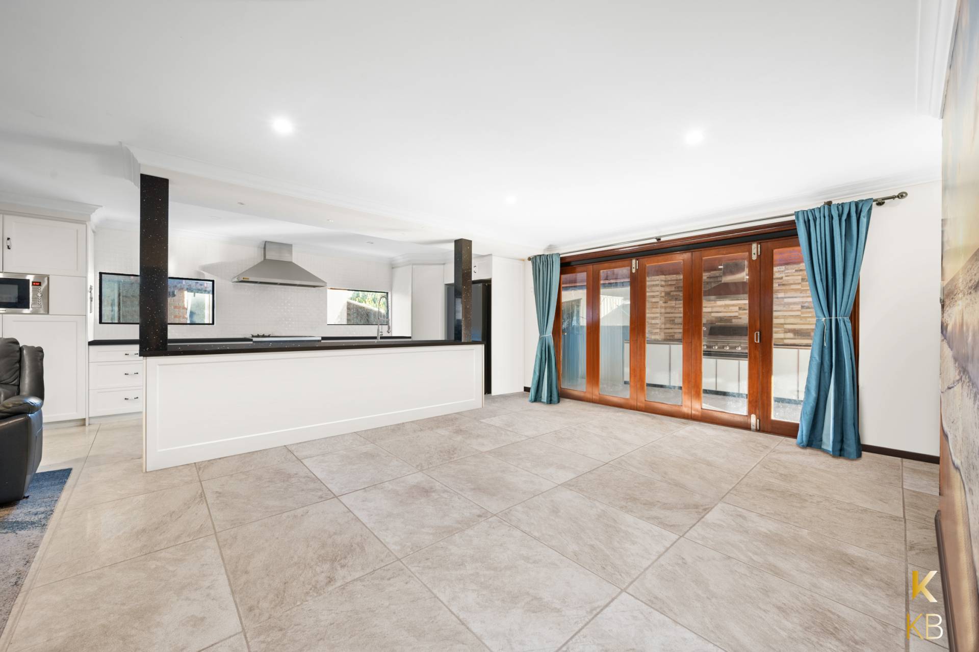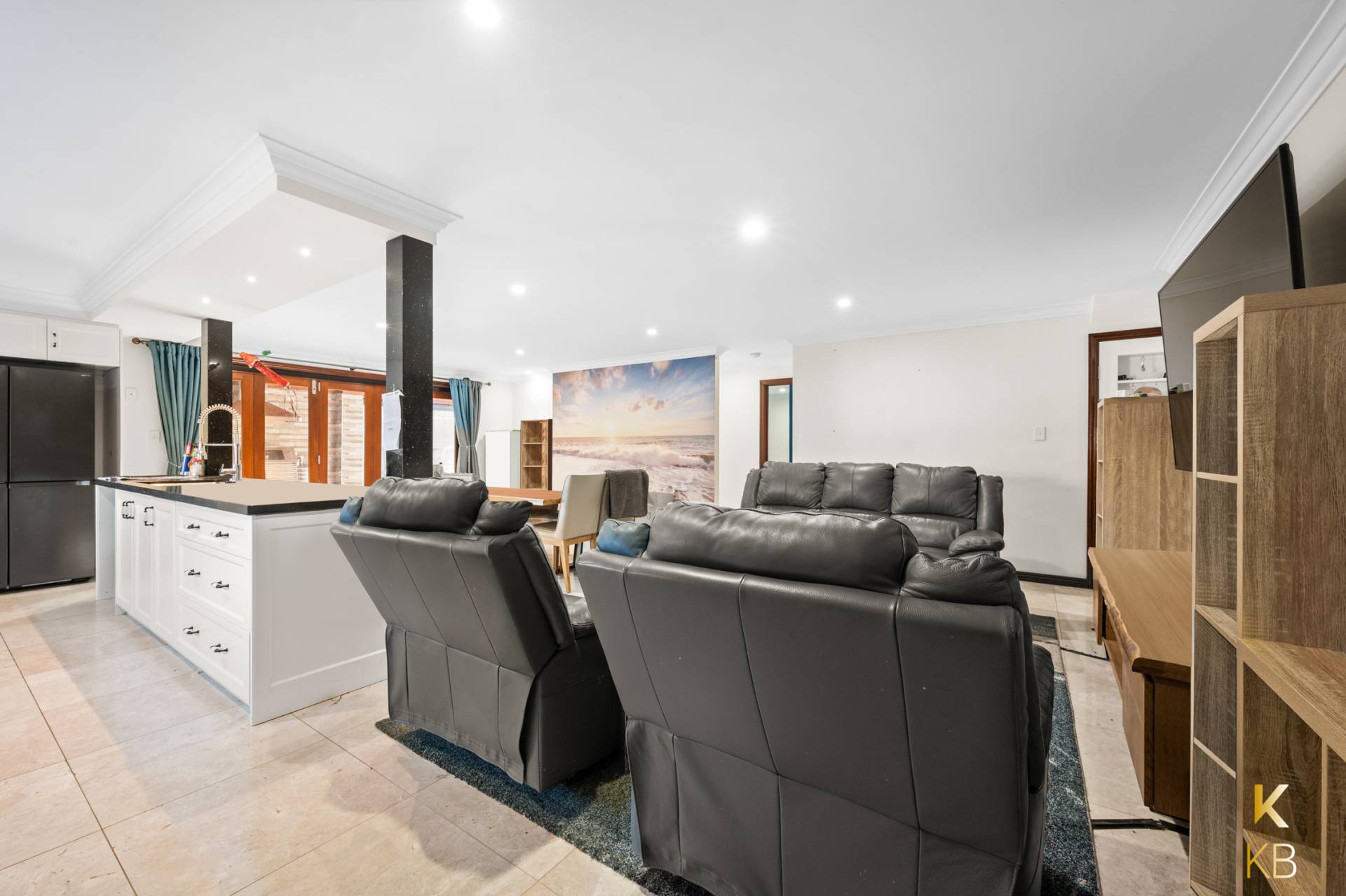 The heart of the home showcases a beautifully renovated open-plan kitchen, dining, and living area. Overlooking the alfresco space, the home effortlessly blends indoor and outdoor entertaining, with bi-fold doors that create a seamless flow between the two zones.
