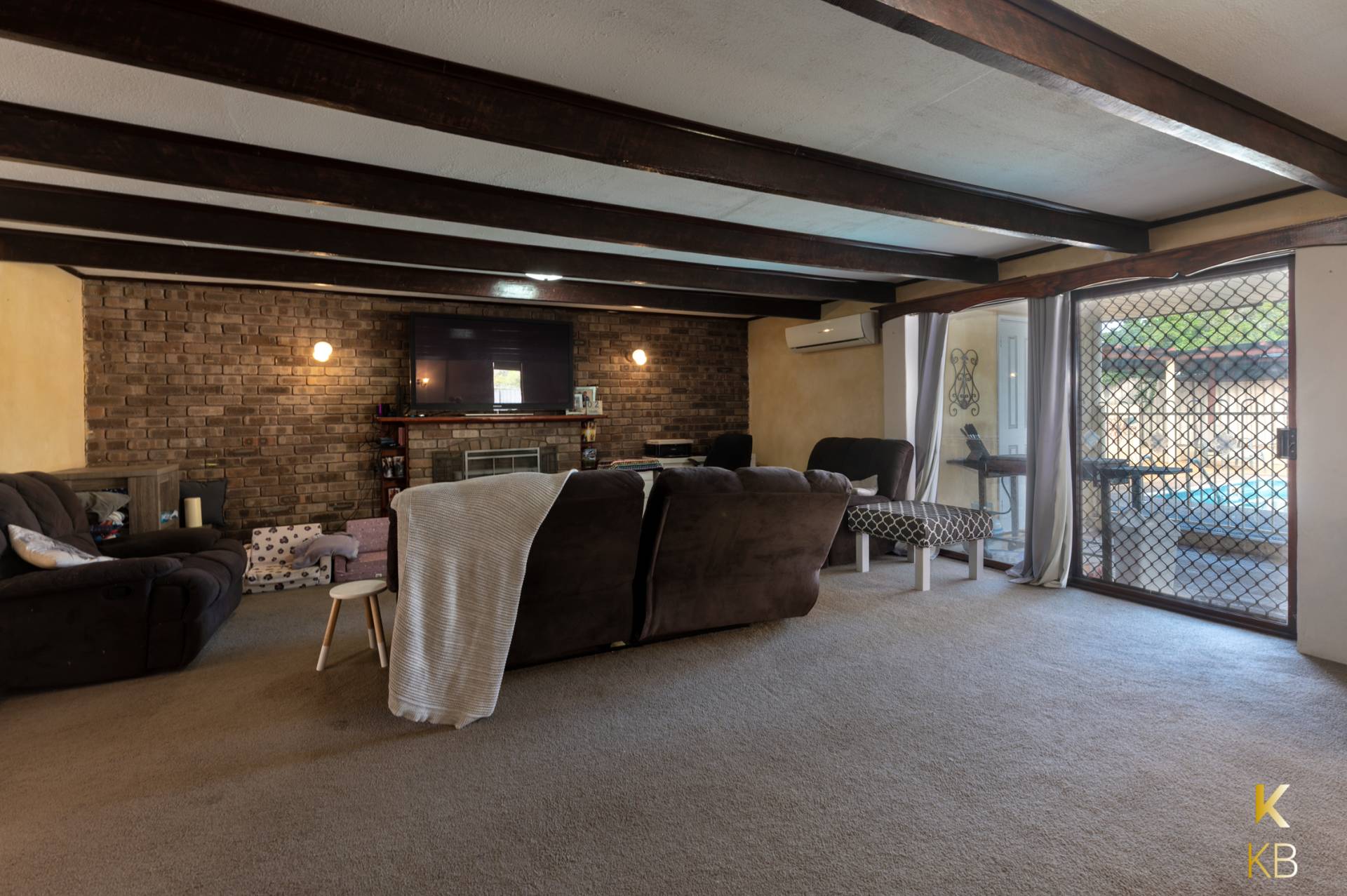 * Huge sunken family room with exposed beams, brick feature wall & r/c air con