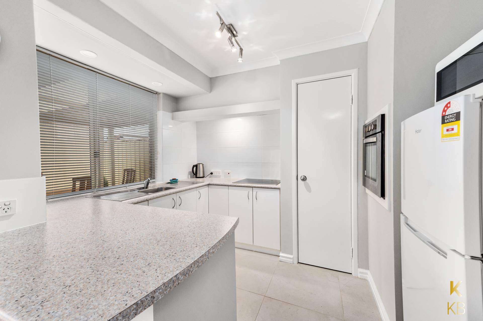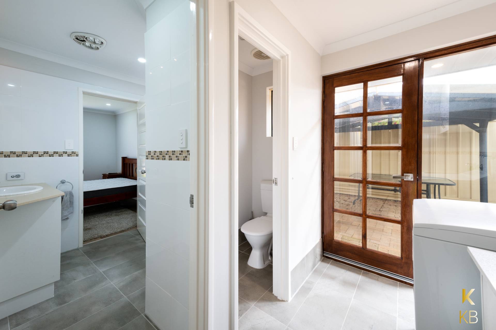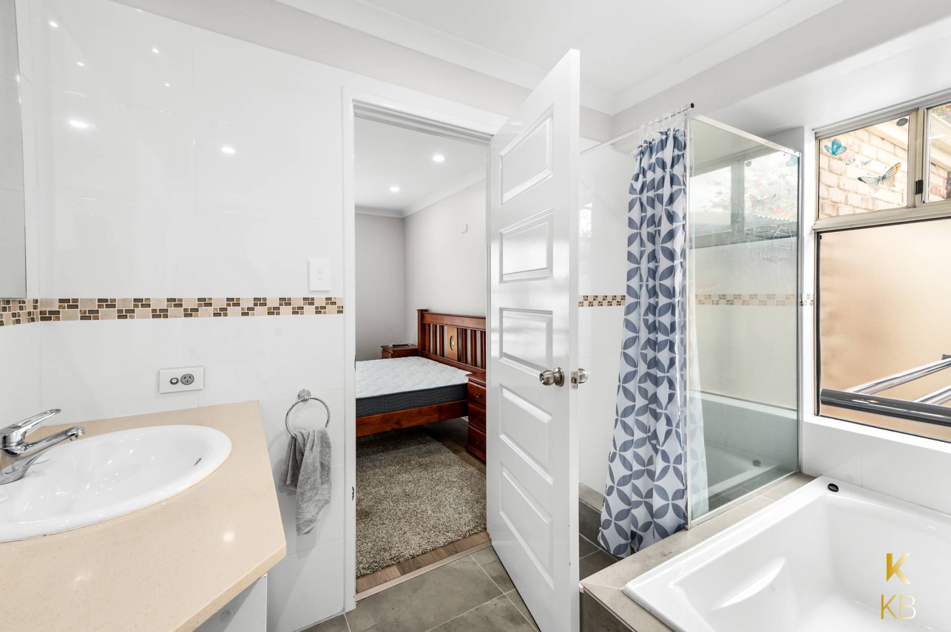 The kitchen with tiled floor offers plenty of cupboard space with new benchtop and fridge recess.  The dining area overlooks the garden with feature French double doors opening out to the undercover patio.  Generous living area has space for a small home office/ play area and benefits from R/C  heating or cooling.  Master bedroom has ceiling fan with ensuite that offers a bath as well as separate shower and tiled floor.  Two single bedrooms both with BIR and one with a ceiling fan.  The laundry has additional storage space, a large sink and the nicest door and window you'll probably see in any laundry.  Conveniently it opens out to a small courtyard and external storage room.